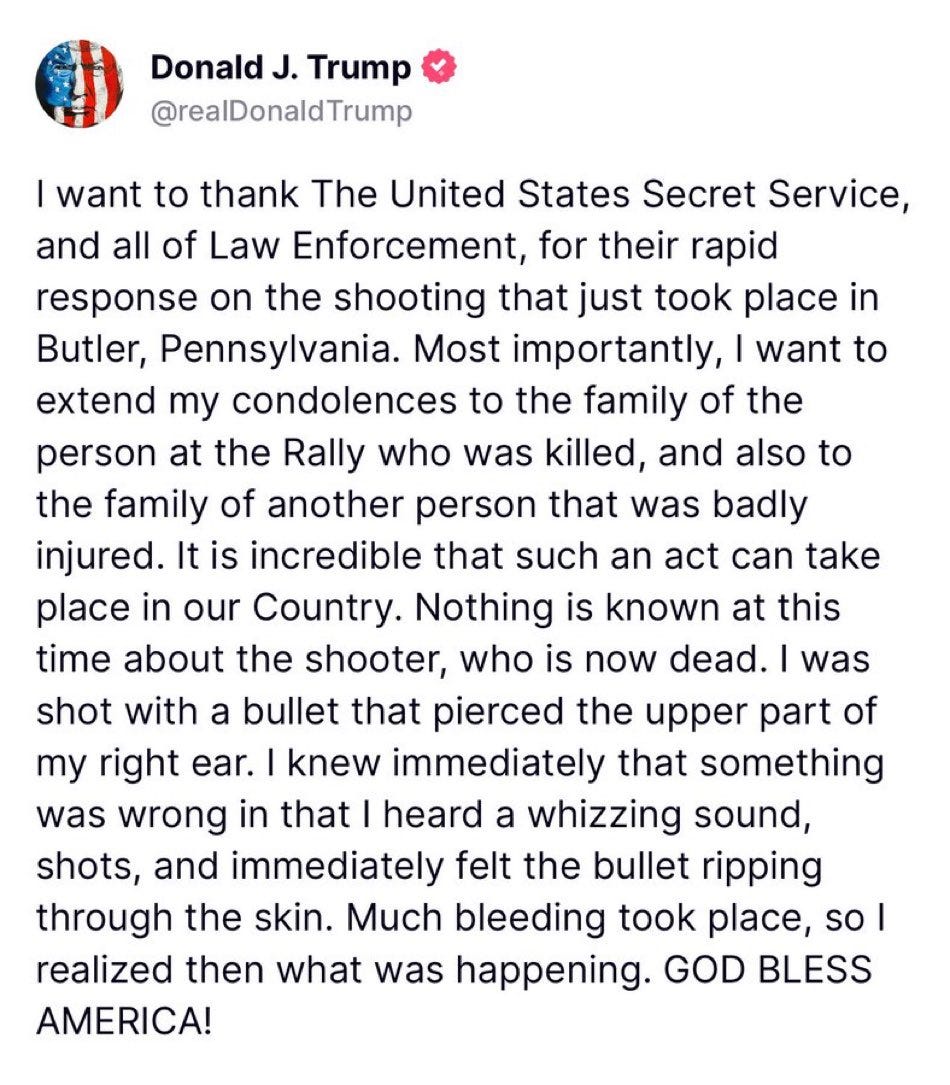 We are awaiting more news on the attempt to kill former President Donald Trump. He was speaking in Butler, Pennsylvania at a campaign rally when shots rang out. One of the first shots hit Mr. Trump in or around his right ear. There was blood strewn across his face. Immediately after he was hit, he ducked down (which probably saved his life.)