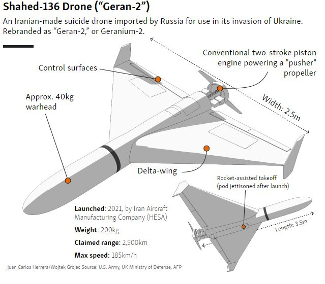 Reportedly the Russian drone used in the attacks was the Geran-2, a Russian-named version of the Iranian Shahed-136 suicide drone.