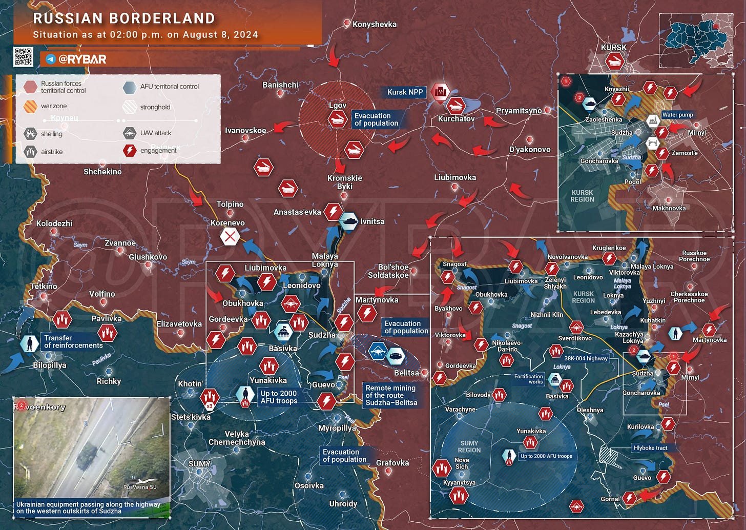 For the record, the Russians are reporting on losses on the Ukrainian side. RT (Russia Today government news site), based on Russian Defense Ministry information, reports that Ukraine has lost up to 945 soldiers as well as 102 armored vehicles, including 12 tanks and 17 armored personnel carriers. The figures include more than 280 troops and 27 armored vehicles destroyed over the past 24 hours in areas bordering Kursk Region. There is no information on Russian losses. Russia has been pounding the Ukrainians with air power, including glide bombs equipped with precision-strike capability.