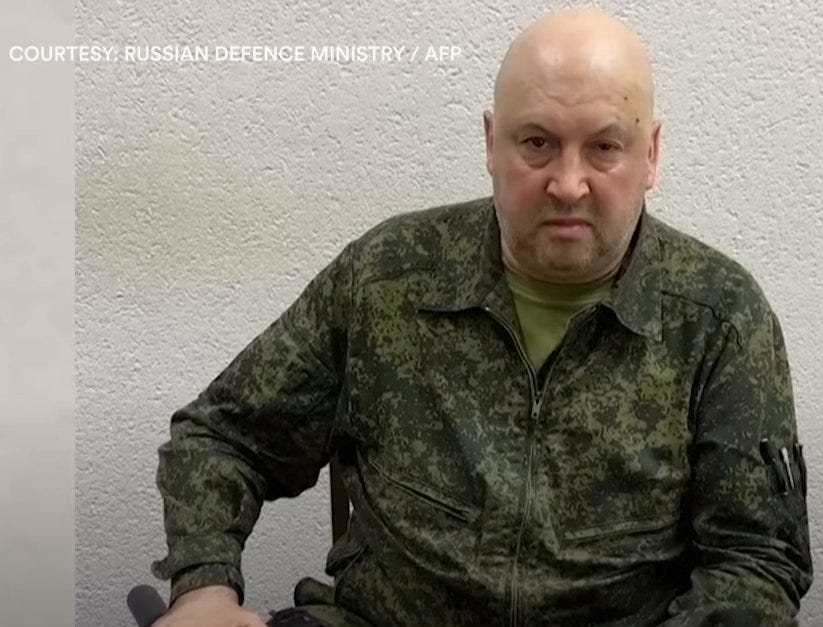 We now know there was no uprising and no one offered to join Prigozhin on his furtive quest. Indeed, even the real operational commander of the Wagner forces, though officially an advisor, and the Deputy head of Russia's special military operation in Ukraine, Sergei Surovikin, who was threatened by Prigozhin, refused to go along with him and published a video where he told Wagner forces not to go into Russia or fight Russians. In the video, Surovikin is sitting with an automatic machine pistol clutched in his right hand.